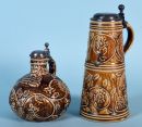 Steinzeug, braune Glasur, reliefierte Verzierungen, verschiedene Formen, Zinndeckel, H= 16/25 cm, 20. Jh.;
