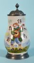 Fayence, beige Glasur, handbemalt, Landschaftsmotiv mit Wandermusiker, Standring und Deckel Zinn, H= 22 cm, wohl 19. Jh.;