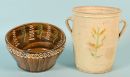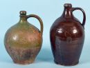 Keramik, braune Glasur, 1 handbemalt mit stilisiertem Blumenmotiv, bauchiger Korpus, H= 26/30 cm, 19. Jh., je leicht bestoßen, 1 mit Glasurschäden;