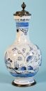 Fayence, beige Glasur, handbemalt, blaues Landschaftsmotiv mit Kirche und Vogel, Standring und Deckel Zinn, H= 30 cm, wohl Hanau, 19. Jh., Rand mit kleinem Chip;