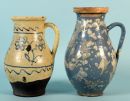 Keramik, beige/blaue Glasur, 1 handbemalt mit stilisierten Blumenmotiven, Balusterkorpus, H= 25/28 cm, 19. Jh., je mit Glasurschäden;