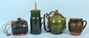 grüne/braune Glasur, verschiedene Formen, H= 18-28 cm, Fässchen, Henkelkanne, Flasche an Lederriemen, Buttertopf mit Holzstampfer, 19. Jh., teils leicht bestoßen;