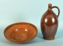 Keramik, braune Glasur, Schale mit beigen Verzierungen und Gebrauchsspuren, D= 32 cm, Balusterflasche H= 34 cm;