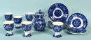 Fayence, blaue Umdruckdekors, 7 Teller, 6 Kakaobecher, 1 Moccakanne, um 1900, teils leicht bestoßen;