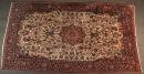 alt, Wolle, feine Knüpfung, hellgrundig, großes, mehrfarbiges Mittelstück, umgeben von floralen Motiven, dunkelblaue Hauptbordüre;
