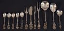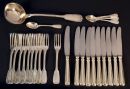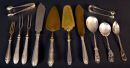 800 Silber, ca. 850 g (ohne Messer), Griffe mit Augsburger Faden, 10 Menuemesser mit Gabeln, 4 Kaffeelöffel, 1 Suppenschöpfer;