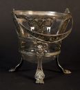 Silber, ca. 165 g, auf 3 Tatzenfüßen, reich reliefierte Verzierungen im Renaissancestil, glockenförmiger Glaseinsatz, H= 13,5 cm, um 1900, undeutlich gepunzt;